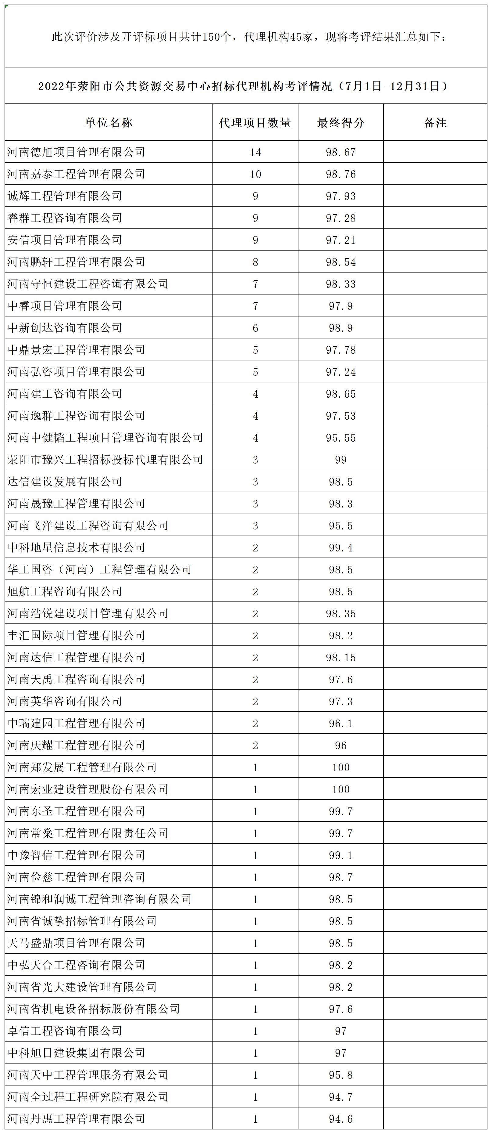 2022年beat365体育登陆网址_3658官方网_365bet在线注册公共资源交易中心招标代理机构考评情况(7月1日-12月31日)