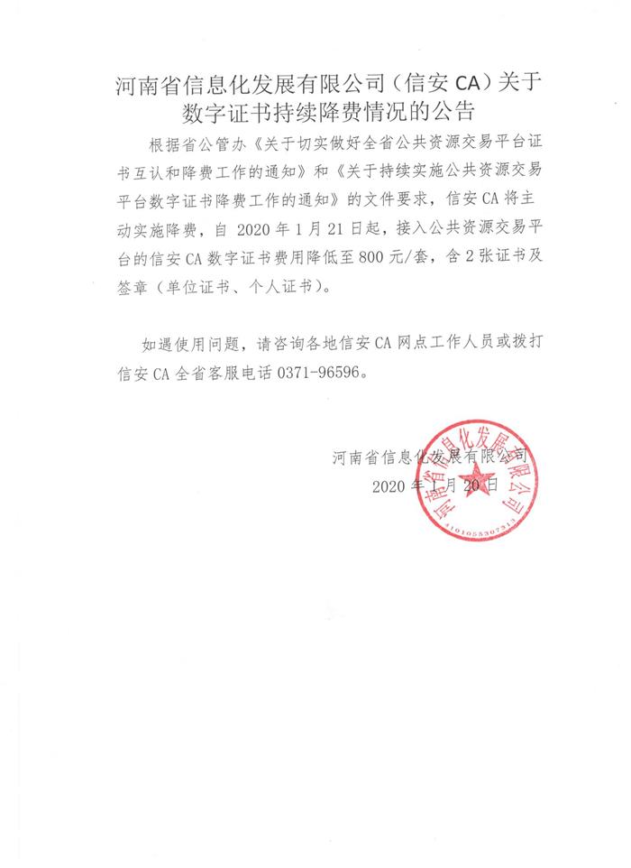 信安CA关于数字证书持续降费情况的公告