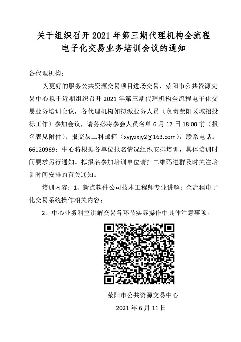 关于组织召开2021年第三期代理机构全流程电子化交易业务培训会议的通知