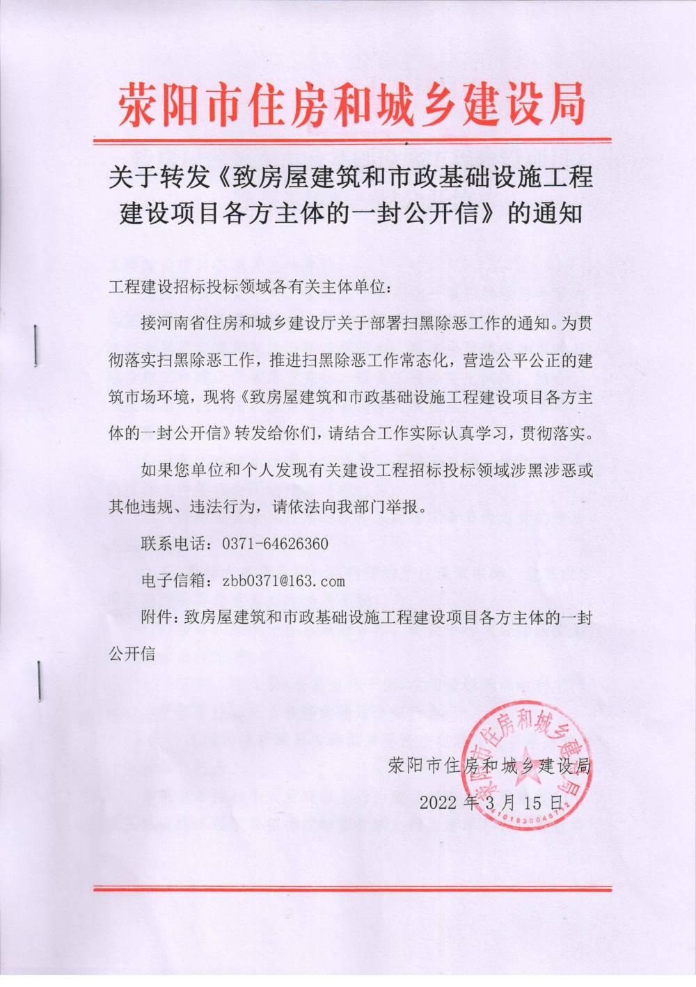 关于转发《致房屋建筑和市政基础设施工程建设项目各方主体的一封公开信》的通知