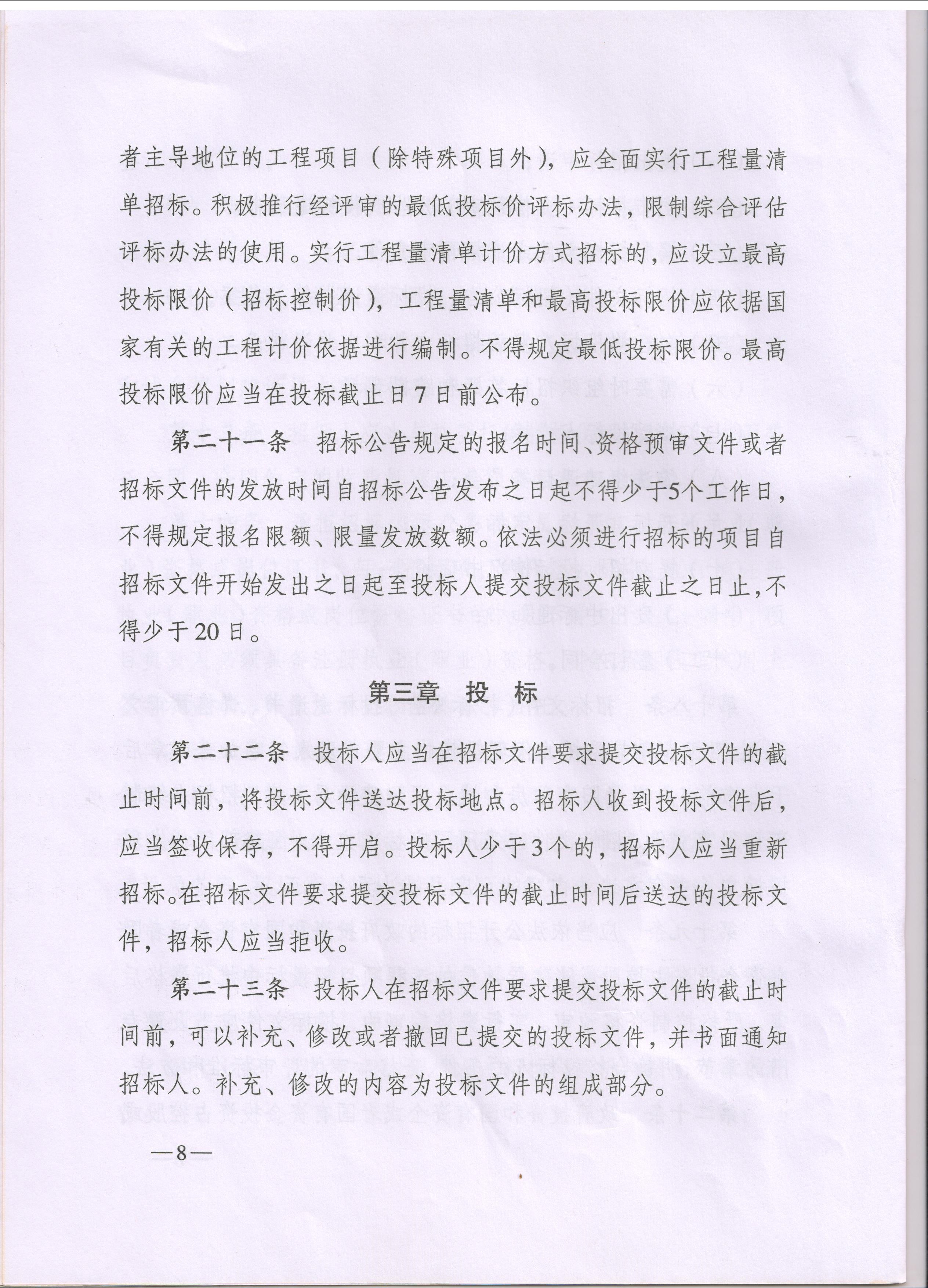 第二十一条 招标公告规定的报名时间、资格预审文件或者招标文件的发放时间自招标公告发布之日起不得少于5个工作日,不得规定报名限额、限量发放数额。依法必须进行招标的项目自招标文件开始发出之日起至投标人提交投标文件截止之日止,不得少于20日。
